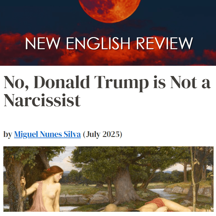 By Miguel Nunes Silva In New English Review *** Ever since Donald J. Trump ran for the US presidency in 2016, recurrent criticism of his politics has frequently been coupled with the ad hominem accusation that Trump is a narcissist, in addition. What this means is that Donald Trump allegedly suffers from Narcissistic Personality Disorder (NPD). […]
